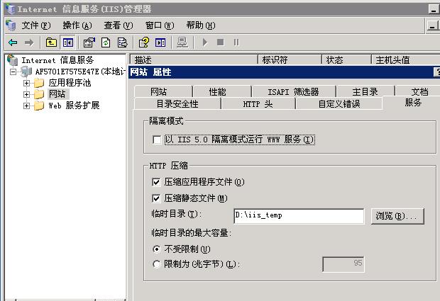 首先,如果你需要压缩静态文件(HTML),需要在硬盘上建一个目录,并给它“IUSR_机器名”这个用户的写权限。如果压缩动态文件(PHP,asp,aspx)就不需要了,因为它的页面是每次都动态生成的,压缩完就放弃。然后在IIS管理器中,“网站”上面右键-属性,不是下面的某个站点,而是整个网站。进入“服务”标签,选上启用动态内容压缩,静态内容压缩。