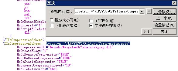 用文本等工具打开 MeteBase.xml > 搜索 Location ="/LM/W3SVC/Filters/Compression/gzip"