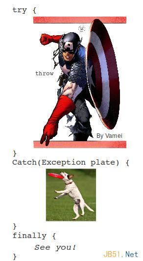 这个异常处理器监视try后面的程序块。catch的括号有一个参数,代表所要捕捉的异常的类型。catch会捕捉相应的类型及其衍生类。try后面的程序块包含了针对该异常类型所要进行的操作。try所监视的程序块可能抛出不止一种类型的异常,所以一个异常处理器可以有多个catch模块。finally后面的程序块是无论是否发生异常,都要执行的程序。