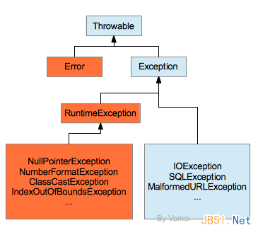 Throwable对象可以分为两组。一组是unchecked异常,异常处理机制往往不用于这组异常,包括:
