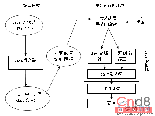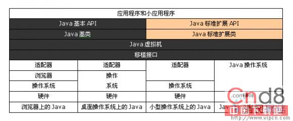 在Java平台的结构中, 可以看出,Java虚拟机(JVM) 处在核心的位置,是程序与底层操作系统和硬件无关的要害。它的下方是移植接口,移植接口由两部分组成:适配器和Java操作系统, 其中依靠于平台的部分称为适配器;JVM 通过移植接口在具体的平台和操作系统上实现;在JVM 的上方是Java的基本类库和扩展类库以及它们的API, 利用Java API编写的应用程序(application) 和小程序(Java applet) 可以在任何Java平台上运行而无需考虑底层平台, 就是因为有Java虚拟机(JVM)实现了程序与操作系统的分离,从而实现了Java 的平台无关性。