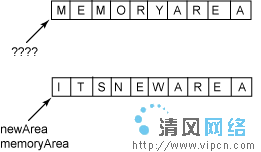 memoryArea 和 newArea 分别被分配了 10 个字节,它们各自的内容如图 4 所示。假如某人执行如下所示的语句(指针重新赋值)……
