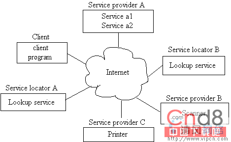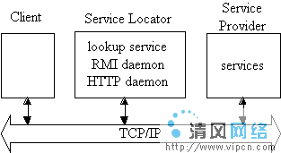 三、基础架构首先要说明的是在 Jini中,呼叫远端 methods的方式,通常是采用RMI的技术 。例如,当client 找到适当的service 时,client可能会使用service端的服务,也就是远端呼叫(remote call),此时即可利用RMI 的技术来完成。(附注:当然,在 Jini中也可以选择不透过RMI,而直接写socket程式来完成远端呼叫。只是若利用RMI时,撰写程式会比较方便。)