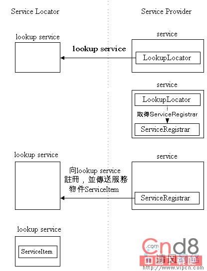 由於我们是利用RMI 的机制提供服务让远端物件使用,所以Service provider所提供的 services必须继续至Remote类别,才能使用RMI功能。另外必须建立 (instantiate)一个 LookupLocator物件与一个 ServiceRegistrar 物件,以便向 service locator注册与使用其他服务。其中 LookupLocator物件是用来寻找特定的 service locator;而 ServiceRegistrar 物件则用来向 lookup service注册本service所提供的服务[4]。具体步骤请参考图三。