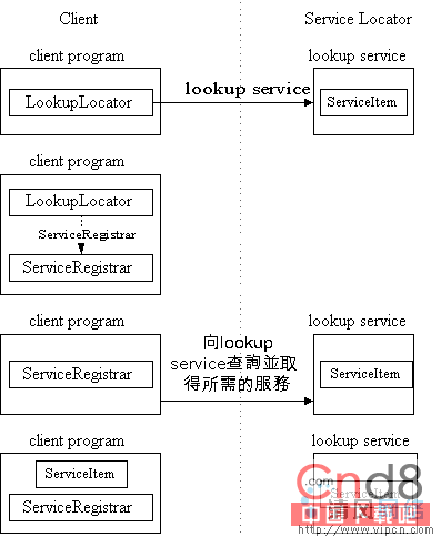 Client同样也必须建立一个 LookupLocator物件与一个 ServiceRegistrar 物件。而 ServiceRegistrar 物件则被用来向 Service provider 取得所 之服务。其过程示意图如图四及图五。