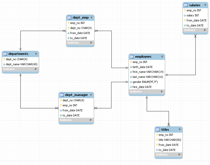 为了讨论索引策略,需要一个数据量不算小的数据库作为示例。本文选用MySQL官方文档中提供的示例数据库之一:employees。这个数据库关系复杂度适中,且数据量较大。下图是这个数据库的E-R关系图(引用自MySQL官方手册):