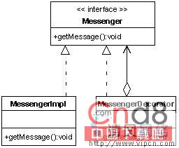 举个例子,考虑这样一个简单的消息传递程序,其主要部分是Messenger接口及其实现类MessengerImpl。让我们假设MessengerImpl对象来自于一个工厂,因此你不能改变其状态。假如你预备增加或改变Messenger对象的功能,你可以创建一个MessengerDecorator类。图2是此例子的类图。