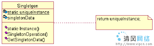 在图1的结构中可以看到,uniqueInstance 就是这个独立的静态变量,它可以记忆对象是否已经实例化了,在静态方法 Instance 中对这个变量进行判定,若没有实例化过就产生一个新的对象,假如已经实例化了则不再产生新的对象,仍然返回以前产生的实例。