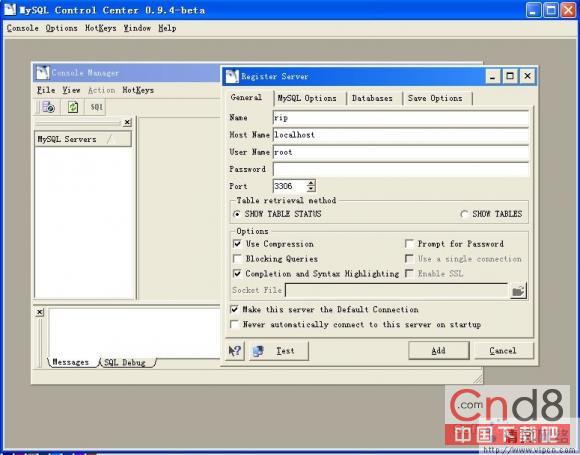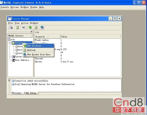 3. 对数据库的操作一般有两种方式,一种是控制台;另一种是图形化操作。简单起见,我们选用后一种方式。而选择的软件是mySQL-Control-Center0.9.4,它也是mysql Group出品的,最大的优点就是免费!我们在mysql的网站上下载安装mysql-cc后,会在桌面上生成一个快捷方式。我们由此进入mysql-cc,用户名"ROOT"密码为空,默认的端口号为"3306",主机名添入"localhost"。确定后,右健选择连接。现在我们就可以操纵自己的mysql数据库了。