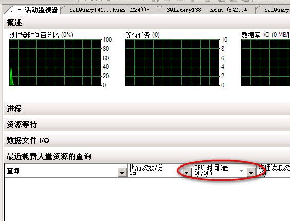 2、从最容易入手的低效SQL开始,考虑是不是最近业务做了什么修改?连接到该SQL实例,打开活动监视器,展开“最近耗费大量资源的查询”,并CPU时间倒序,在这里并未发现有即时的耗费资源的查询。据个人经验,这里的值如果是4位数,分钟内执行次数3位数,一般的服务器CPU大概就10%以上,如果cpu时间那里是5位数,且分钟内执行次数也很高,几百次以上,那CPU一般就会不淡定了。图片仅为演示
