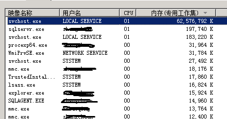4、OK,既然这样,是谁占用了本该属于我亲爱的SQL Server的内存呢?我们继续,打开Wiindows任务管理,选定进程选项卡,点击显示所有用户进程,发现svchost.exe占用了绝大多数的60G内存!