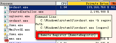 5、那svchost.exe又是个什么东西呢?我们下面就用到ProcessMonitor这个工具了,打开后自动加载所有Wiindows进程,按内存排序后,鼠标移至svchost.exe进程上,显示为Remote Registry服务。