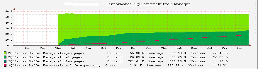 附一张内存监控图,可以看到服务重启之后,SQL Server的Total Pages一直在上升,并逐渐稳定,Page life expectancy也在变得越来越大,CPU也能指示病症已消除,我很欣慰。
