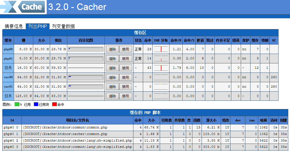 但实际上Xcache不但能缓存变量,而且能缓存php文件,如果你的php环境中配置了Xcache扩展后,它会自动将每次给你访问的php文件都自动缓存。无需再额外的修改代码,十分的方便快捷,如下图的我只访问了phpmyadmin,Xcache官方的程序包就可以检测到phpmyadmin的cache列表。