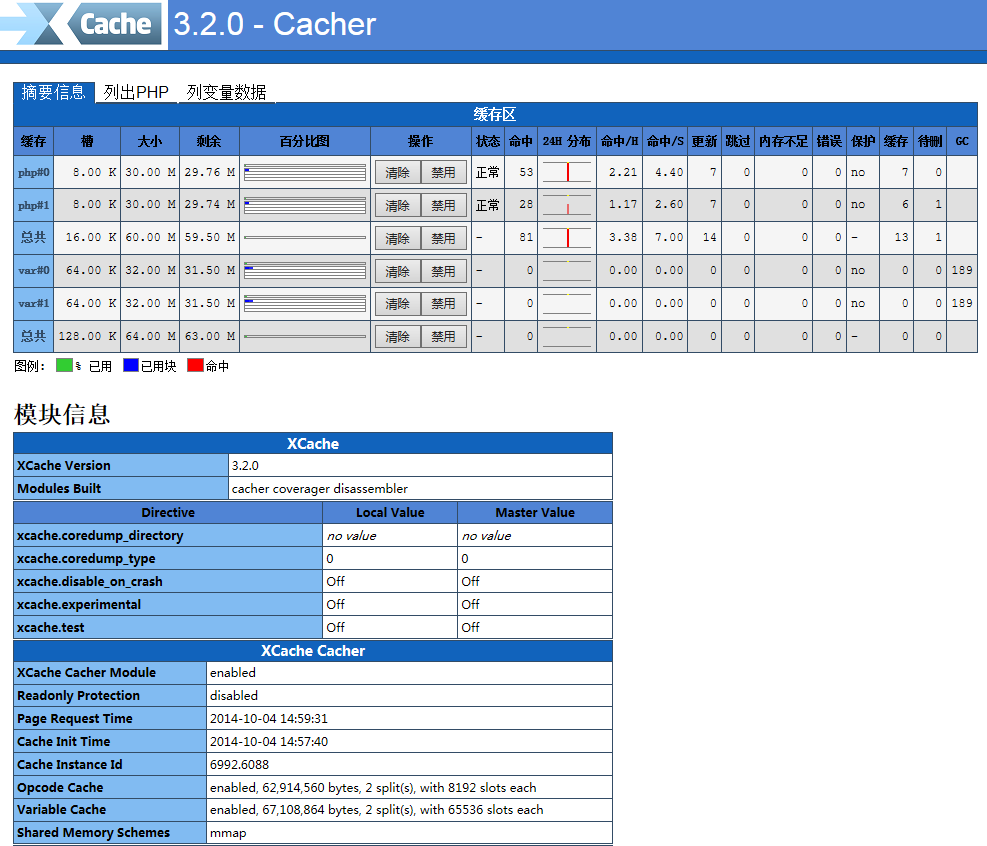 在浏览器输入http://127.0.0.1/xcache/htdocs/, 会弹出一个登陆的账号密码对话框,输入进去后,你就可以看到xcache的环境及配置,变量等等。。