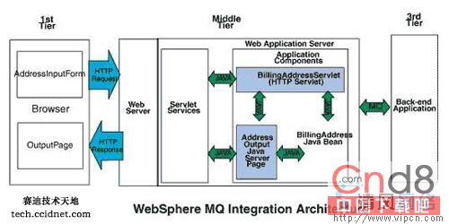 用户填写 HTML 表单。 将表单发送给 servlet。 servlet 将该 HTTP 请求转换成一个 MQSeries 消息,并将其放入一个队列。 后端应用程序处理该消息,然后通过消息队列发回一个应答。 servlet 从队列中检索消息,并将其存放在一个 Java Bean 中。 然后 servlet 调用编译过的 JavaServer Page 并动态生成结果 HTML 页面。 jsp 从 Java Bean 检索该页面的消息内容,将其合并到 HTML,然后将结果页面回显在浏览器上。