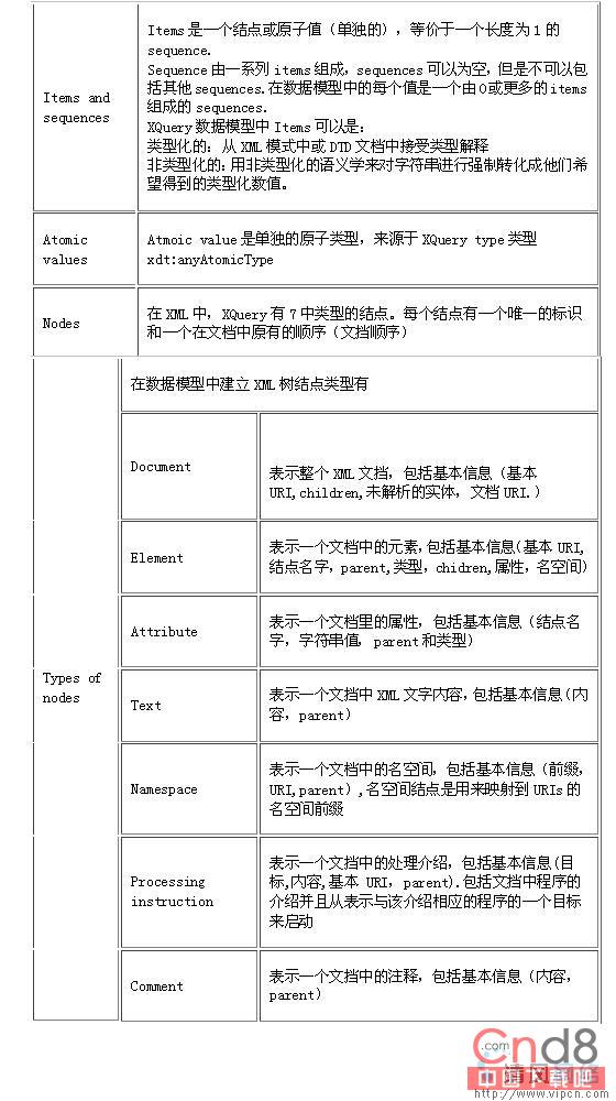 XQuery数据模型XQuery数据模型比XML Infoset and Post-Schema Validation Infoset (PSVI)的XML数据模型更具有扩展性。XQuery通过数据模型的操作来定义,但他约束了数据模型中文档和事例的组织。这个数据模型由被搜索的XML数据、所有中间值和最终查询结果组成。他支持可以产生非XML数据、XML碎片和类型与非类型数据的中间表达式。