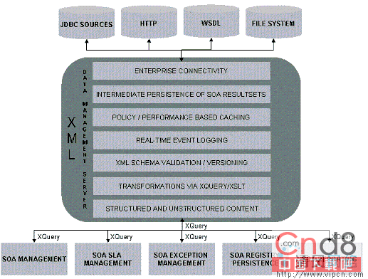 我们可以用下列方式描述XML数据治理的用途――SOA元数据的持久化――SOA的发现、发布和签署――Web services治理数据的持久化――加速caching――服务集成――服务策略的caching和治理