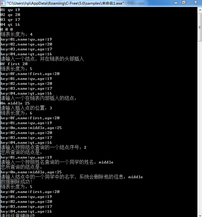cout<<"请先输入链表中的数据,格式为:学号,姓名,年龄(年龄为0时停止输入)"<<endl;