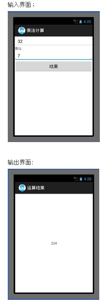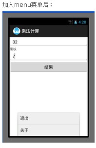 在第一个界面中的2个乘数输入处分别输入2个数字,按下结果button,会自动跳到第二个界面并显示输入2个数字相乘的结果。如果在第一个界面中点击系统的menu按钮,则会自动弹出一个菜单,菜单栏包括退出和关于2个按钮,点击退出按钮,则退出了该程序。