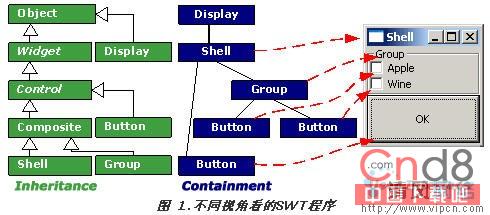 图1 说明了一个SWT应用程序的不同看法。第一幅图是简化的UI对象的继续图。第二幅图是UI对象的包含结构。第三幅图就是创建了的UI。