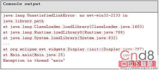 然后,你可以编译SWT应用程序,但是由于抛出下边所示的运行时异常,无法运行它,因为swt.jar使用了本地库。你需要设置java.library.path环境变量来在Java中使用本地库。