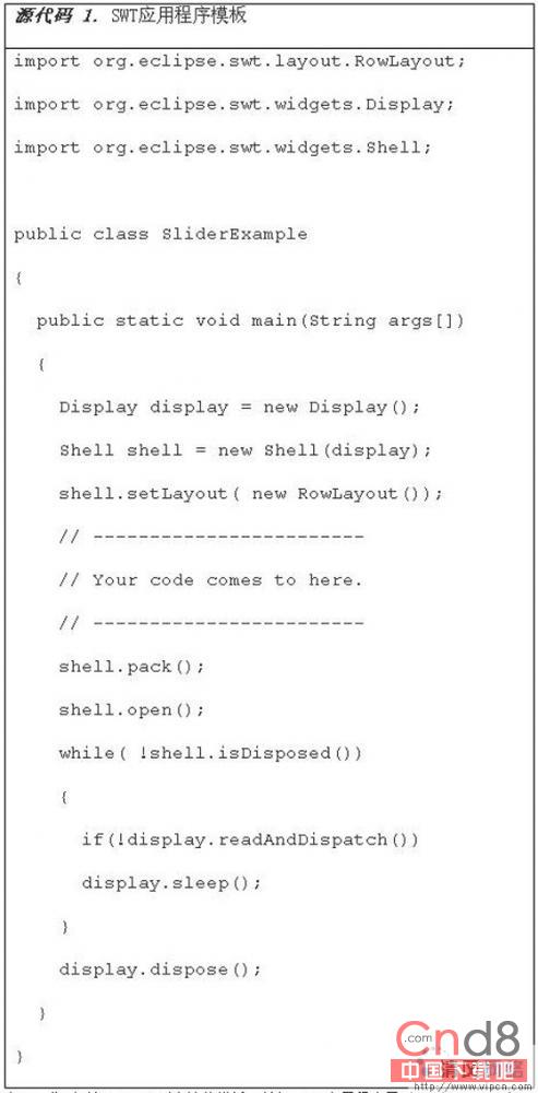 这个例子显示了一个空的窗口。你可以加widget到上边的模板。任何SWT应用程序需要 一个Display和一个或多个 Shells。这个Shell是个合成对象;它可以容纳其他的合成对象。假如没有设置shell的 layout,加到Shell的widget是不能看见的。Shell窗口必须 打开才能显示。 事件处理循环读取并转发GUI事件。假如没有事件处理循环应用程序窗口是无法显示的。即使通过open()方法来打开Shell窗口。让后,需要在Shell被丢弃的时候销毁 Display。