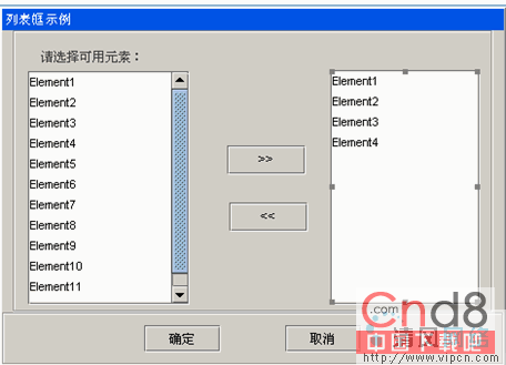 现以图1所示为例对具体实现方法进行描述。由图1中左面列表框中选择可用元素,选择方式设为多个间断选择,由于其他两种方式相对简单,实现方法可在这个实例的基础上修改得到。选定元素之后,点击“>>”按钮,选择的元素就会在右面的列表框显示出来。假如多选或者错选,可在右面的列表框中选定元素后点击“<<”按钮移去选定的元素。