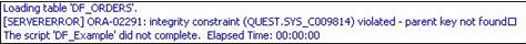 SQL> select owner, constraint_name, table_name, column_name 2 from all_cons_columns 3 where constraint_name like '%9814%'; OWNER CONSTRAINT_NAME TABLE_NAME COLUMN_NAME ----- ------------------------------ -------------------- ------------ QUEST SYS_C009814 DF_ORDERS CUSTID SQL> alter table df_orders 2 disable constraint sys_c009814; Table altered. |