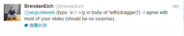 北京时间今天凌晨,来自Twitter的前端工程师Angus Crol,在柏林举办的JSConf会议上,进行了题为"Break all the Rulez"的演讲,主要讲了一些我们通常认为是错误的不该使用的东西,其实是有用的.本文最下面有演讲用的slides.远在美国的JavaScript之父看了slides也说:我同意其中大部分观点(看来还是有问题?).