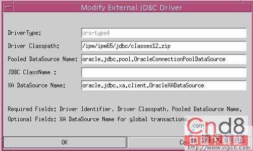 先打开iPlanet Application Server 6.5的治理控制台,选中"database"面板,再选择"External JDBC Drivers"选项后,点击"Add…"按钮,在弹出的对话框中,添加一个名为"ora-type4"的JDBC Driver。