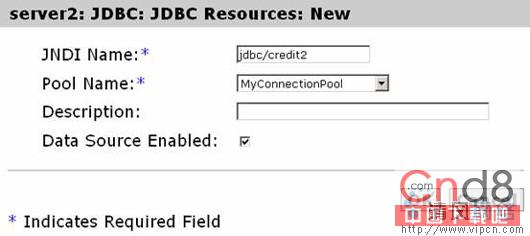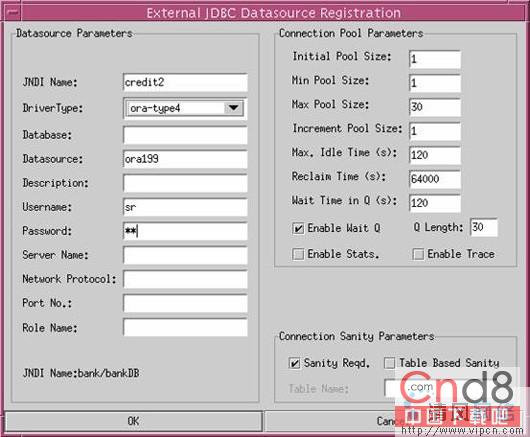 Driver Classpath:该参数填写classes12.zip文件的物理路径。然后在"External JDBC DataSources"中选择"Add…",在弹出的对话框中添加一个JNDI名称为"credit2"的数据源。
