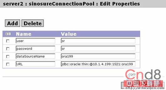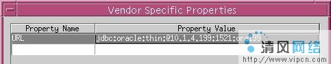 Connection Pool Parameters:图中显示的是缺省设置,可以根据自己环境情况来更改这些设置。保存完设置后,在"DataSource Selection Box"中,选择刚添加的"credit2"数据源,再选择"Vendor Specific Properties"按钮。在对话中添加一个URL属性。