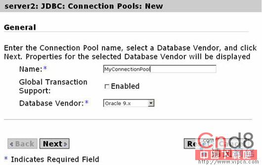 添加一个名称为"MyConnectionPool"的Oracle数据库连接池。"Next"下一步。