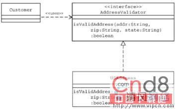 不同的客户对象创建Customer对象并调用(invoke)isValidAddress方法验证客户地址的有效性。为了验证客户地址的有效性,Customer类期望利用一个地址验证类(address validator class),这个验证类提供了在接口AddressValidator中声明的接口。
