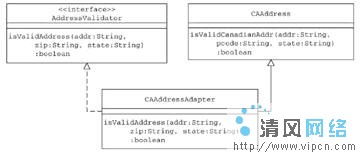 因为适配器CAAdressAdapter实现了AddressValidator接口,客户端对象访问适配器CAAdressAdapter对象是没有任何问题的。当客户对象调用适配器实例的isValidAddress方法的时候,适配器在内部把调用传递给它继续的isValidCanadianAddr方法。