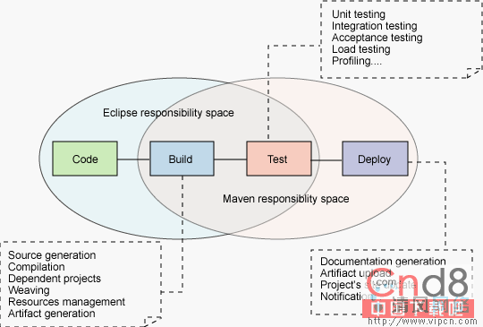 渐渐地,一些工具开始假定某些特性可以完全并且顺利地集成在一起,Maven 和 Eclipse(即使作为一个简单的 IDE)也不例外。因此,从构建的角度来看,二者似乎出现了重叠,如图 1 所示。