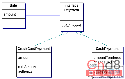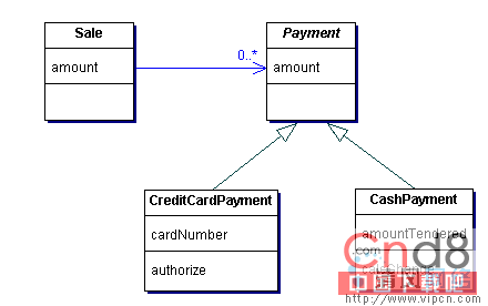 Java中的extends要害词声明了继续关系,相当于UML中的“一般化”(Generalization,也译为“泛化”)关系,在UML图形中用子类向超类的实线空心封闭箭头表示。图一额外增加了一个Sale类,这是为了更清楚地说明UML一般化关系与UML定向关联关系所用箭头的不同。关联关系与一般化关系的另一个不同之处在于,一般化关系的两端不需要说明多重性或角色名称。