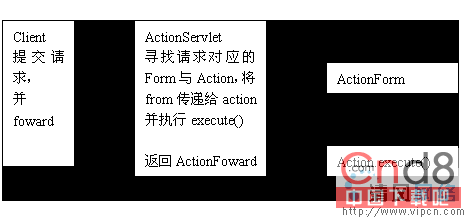 一个请求提交给ActionServlet,ActionServlet会寻找相应的Form和Action,首先将提交的request对象,映射到form中。,然后将form传递给action来进行处理。action得到form,对xml的mapping,request,response四个对象,并调用execute()方法然后返回一个forward-url(相应视图)给ActionServlet,最终返回给客户端。