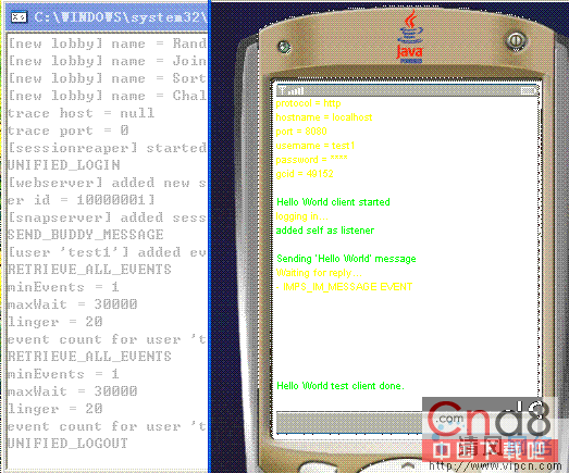 启动安装SNAPMobile的目录下SNAPMobile oolsServerEmulator的服务器端模拟器 emu.bat,会出现一个DOS运行框,里面有发布信息,然后再运行客户端的模拟器,就会出现欢迎信息,完成登陆。