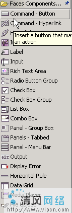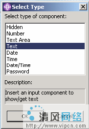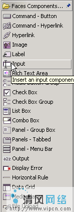 图 11. 特性 接下来,在 jsp 页面的标签下添加一个空格。从选项板(图 12),选择 Input 组件并把它拖到 Access Stock 输出组件的后面。 图 12. Faces Components 选项板 再一次从 Select Type 对话框