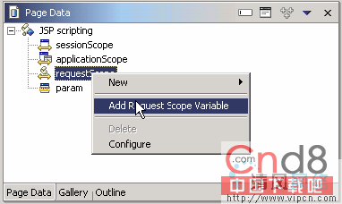 在 accessStock.jsp 还保持打开的同时,转到位于工作台左侧中部的 Page Data 视图。选择 JSP scripting,右键单击 requestScope,然后选择 Add Request Scope Variable(图 18)。