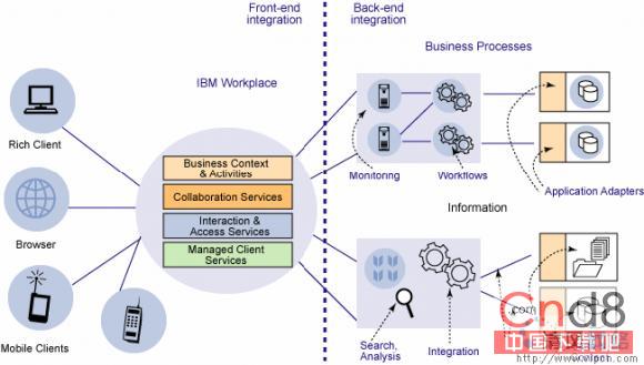 IBM Workplace 将后端系统的力量扩展到了前端。它通过一系列产品和技术做到了这一点,这些产品和技术帮助交付了可选的服务器托管客户机,从而支持在大量访问点和连接方式中的多种用户类型和用户体验。这使终端用户可以灵活有效地访问人员、业务流程、应用程序和内容。图 1 显示了 IBM Workplace 及其服务器托管客户机如何使这个集成过程对终端用户透明。