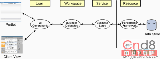 如上所示, User 层 提供了用户界面,例如,portlet、富客户机平台视图和其他 UI 组件。