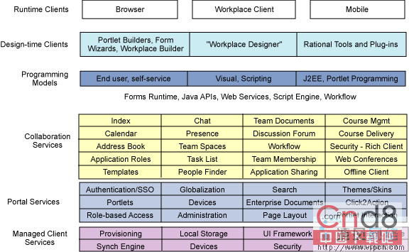 该平台还包括 IBM Workplace Client Technology,可以将它看作桌面中间件平台。该客户机包含加密的 Java RDB 数据存储、个人 Enterprise JavaBeans(EJB)容器、Eclipse 富客户机框架,以及从门户网站服务器读取布局和下载组件的能力,所有这些都具有基于策略的集中式治理和自动配置。该客户机具有完全桌面富客户机版本和普及的聚焦设备的宏版本。 参考资料中有关于 IBM Workplace Client Technology 具体信息的链接。)