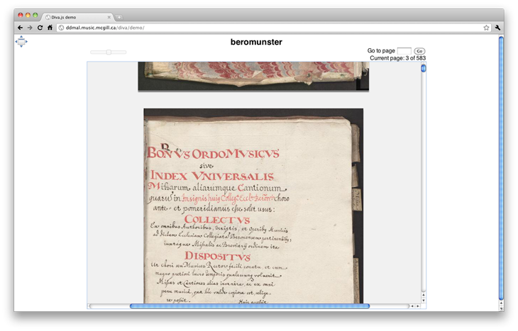 Diva是一个Javascript的前端工具,用于浏览文档,旨在与数字图书馆协同并作,将多页的文档呈现成单页连续的项。它运行在IIPImage服务器上,适用于管理图书以及书店网站。