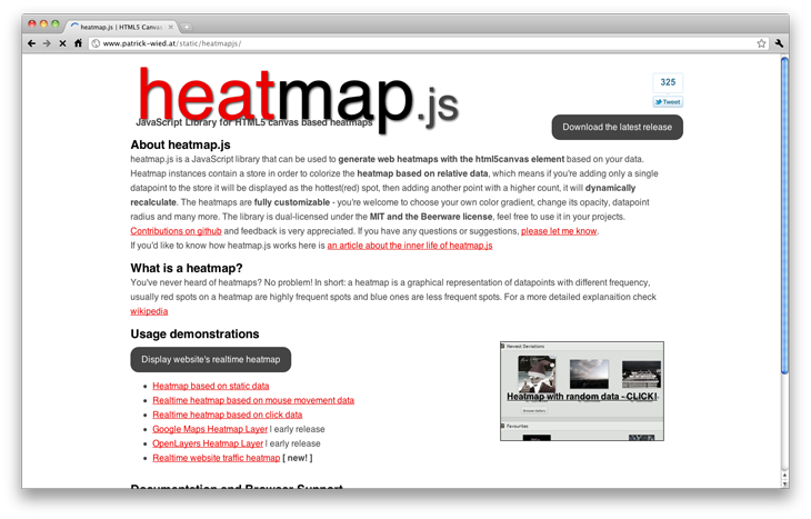 日复一日,JavaScript继续用它无限的能力使我惊讶着:例如,heatmap.js可以基于你的数据用html5 canvas元素生成网站热图。简单而高效!