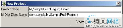 2.现在,在刚才打开的窗口中点击新建工程图标。会打开一个弹出窗口;在那里你可以指定工程名称和MIDlet类名。在工程名称中输入MySamplePushRegistryProject,在MIDlet类名中输入com.sample.MySamplePushRegistry。