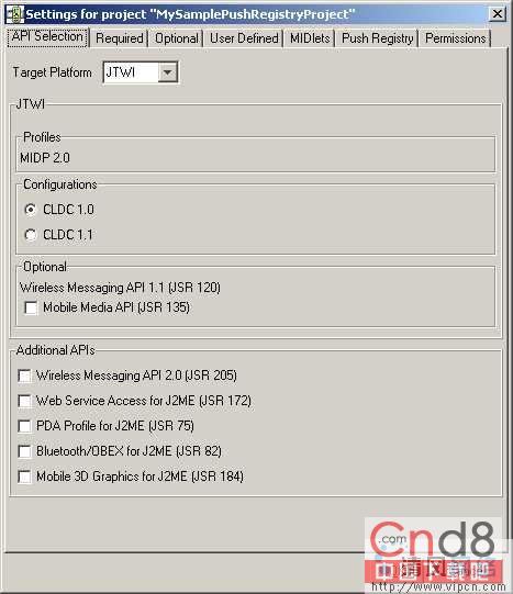 3.在步骤2后,会自动出现另一个弹出窗口,它将答应你设定项目的其他设置。确保你在API 选择标签中。在此标签中,从目标平台下拉菜单中选择JTWI(假如还没有选择)。同样确保CLDC 1.0单选按钮被选中。不要钩选Mobile Media API多选框(因为不会使用任何跟多媒体有关的API)。请参考图4。
