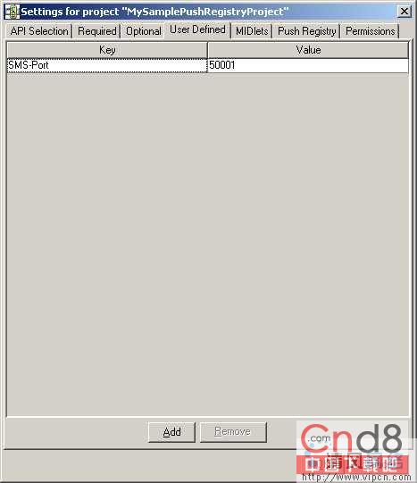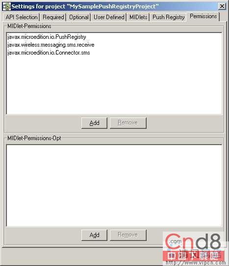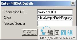 10.在步骤9后,假如你观察由以上步骤产生的jad文件,C:/WTK22/apps/MySamplePushRegistryProject/bin/MySamplePushRegistryProject.jad(假设J2ME Wireless Toolkit 2.2被装在目录C:/WTK22中),你会找到在前面步骤中设定的完整配置。所有条目中最重要的一个如下:MIDlet-Push-1: sms://:50001, com.smaple.MySamplePushRegistry, *. 此条目确保你的应用程序监听50001端口上的SMS消息。